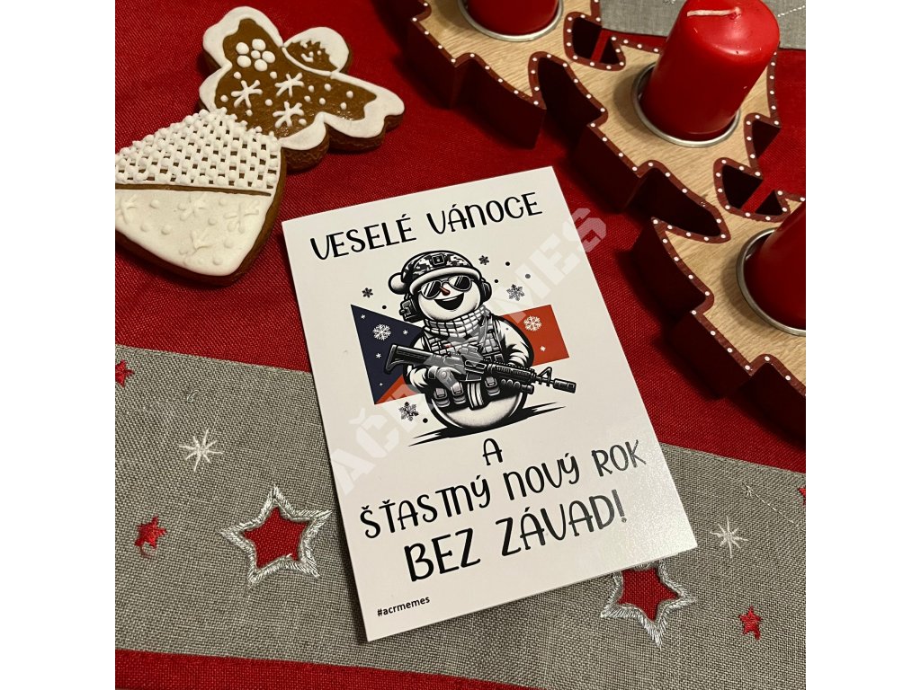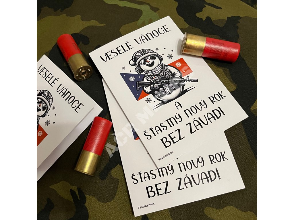 Vánoční / novoroční přání pro všechny střelce a střelkyně či kolegy a kolegyně sloužící v Armádě České republiky, nebo kohokoliv, koho chcete potěšit originálním přáním k Vánocům! Opět neobyčejné, „gumácké“ první a jediné v České republice! Roztomilé a přísné zároveň, prostě, „MUST HAVE“ záležitost… Přání je zavírací s dvojstránkou uvnitř pro vaše věnování, podpisy kolegů atd.